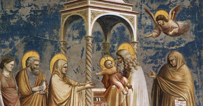 Iz evanđelja sv. Luke doznaje se da je Gospa prikazala Isusa samo malo poslije slušanja proroštva. Ponudila je za njegovo spasenje par golubica, prinosnicu siromašnih, umjesto janjeta propisanog u Mojsijevu zakonu. Međutim, u svjetlu Šimunovih riječi, shvatila je da je Isus bio istinski Jaganjac koji će otkupiti ljude od njihovih grijeha i da će ona, kao majka, na način koji tada nije mogla razumjeti, biti tijesno sjedinjena sa sudbinom svoga Sina.